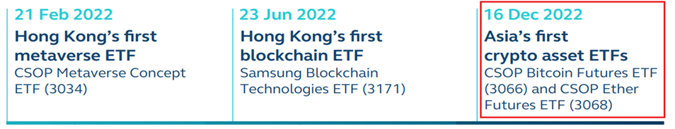 بورس اوراق بهادار هنگکنگ اولین بورس آسیایی است که اقدام به پذیرش صندوقهای قابلمعامله رمزارز کرده است. کمیسیون اوراق بهادار و آتی هنگکنگ در ۳۱ اکتبر ۲۰۲۲ میلادی مجوز عرضه عمومی صندوقهای قابلمعامله آتی رمزارز را صادر کرد که در آن استراتژی اصلی صندوق، سرمایهگذاری در قراردادهای آتی مبتنی بر رمزارزها است. بنابراین این صندوقها امکان سرمایهگذاری مستقیم در رمزارزها و خرید نقدی آنها را نداشتند. در ۱۶ دسامبر ۲۰۲۲ میلادی اولین صندوقهای قابلمعامله رمزارز در آسیا در بورس اوراق بهادار هنگکنگ پذیرفته شدند. این صندوقها شامل صندوق قابلمعامله آتی بیتکوین و صندوق قابلمعامله آتی اتریوم بودند که ناشر آنها شرکت مدیریت دارایی CSOP است. در ادامه در ۱۳ ژانویه ۲۰۲۳ میلادی یک صندوق قابلمعامله آتی بیتکوین توسط شرکت مدیریت دارایی Samsung نیز در بورس هنگکنگ عرضه شد.