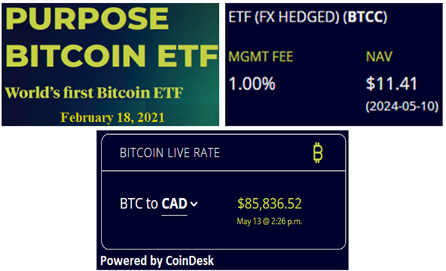 اولین صندوق قابل معامله با پشتوانه بیتکوین در کانادا، صندوق قابل معامله بیتکوین با نماد BTCC است که در ۱۸ فوریه ۲۰۲۱ میلادی در بورس اوراق بهادار تورنتو راهاندازی شد.