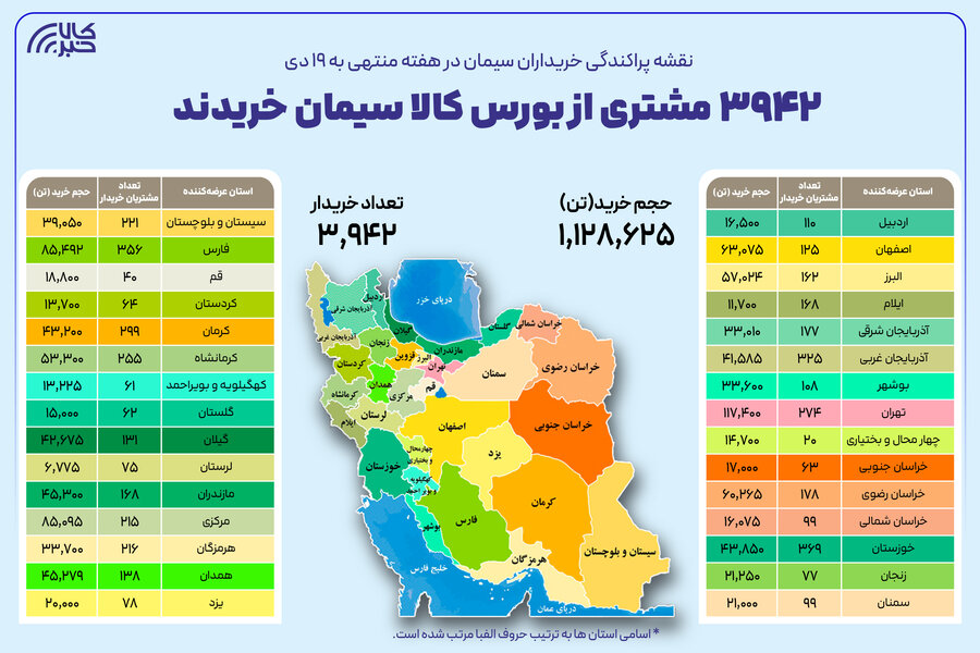 طبق آمار، به ترتیب استانهای تهران با ۱۱۷ هزار و ۴۰۰ تن، استان فارس با ۸۵ هزار و ۴۹۲ تن، استان مرکزی با ۸۵ هزار و ۹۵ تن و استان اصفهان با ۶۳ هزار و ۷۵تن در صدر جدول حجم خرید سیمان از بورس کالا قرار داشتهاند.