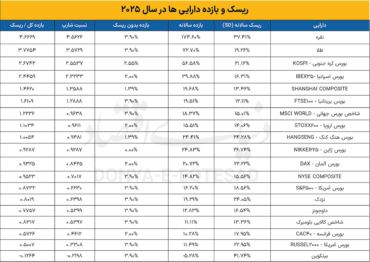 در ادامه، دیگر ستاره سال طلا بود. اگرچه طلا از نظر میزان بازدهی به اندازه نقره رشد نکرد، اما به دلیل ریسک کمتر، در میان یکی از بهترین نسبت بازدهی به ریسکها (نسبت شارپ) جایگاه خود را تثبیت کرد. طلا در ازای تحمل هر واحد ریسک، به سرمایهگذاران خود 3.7واحد پاداش داده است. ریسک سالانه طلا حدود ۲۰درصد گزارش شده و در عین حال بازدهی قابلتوجهی را هم ثبت کرده است. این ترکیب باعث شده است که طلا همچنان نقش سنتی خود را بهعنوان دارایی امن اما درعینحال سودده حفظ کند.