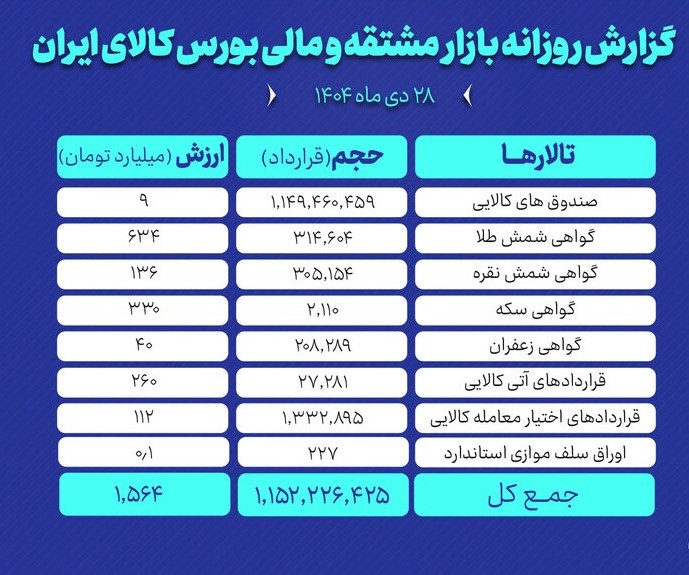 افزون براین، بازار قراردادهای آتی ۲۷ هزار و ۲۸۱ قرارداد آتی کالایی به ارزش ۲۶۰ میلیارد تومان منعقد شد.