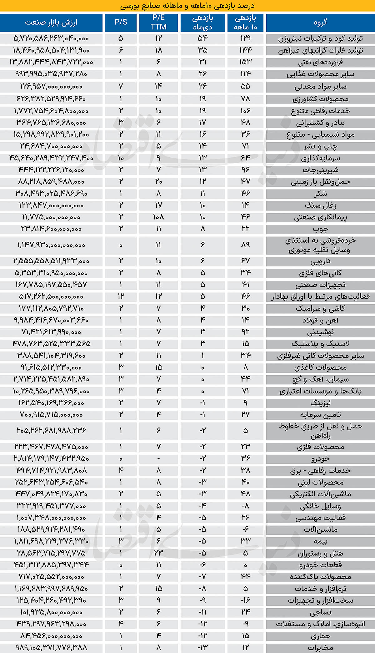 در صدر جدول بازدهی ۱۰ماهه، صنعت فرآوردههای نفتی با ثبت رشد ۱۵۳درصدی از ابتدای سال تا پایان دیماه قرار گرفته است.