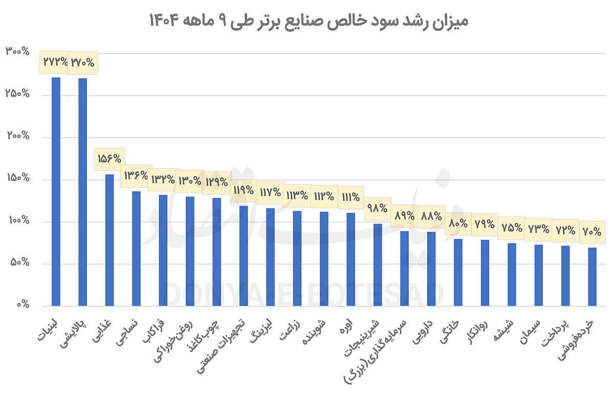 با در نظر گرفتن شرکتهایی که مجموع سود چهار فصل آنها مثبت است (TTM مثبت)، بررسی گزارشهای ۹ماهه نشان میدهد صنعت پالایشی و صنعت غذایی با رشد بیش از ۲۷۰درصدی سود خالص، برترین عملکرد را در میان ۵۰ صنعت بورسی به ثبت رساندهاند. بررسی عملکرد ۹ ماهه صنایع بورسی نشان میدهد تمرکز سودآوری در این دوره عمدتا در صنایعی بوده که از تغییرات نرخ ارز، بهبود شرایط فروش یا اصلاح نسبی سیاستهای قیمتی منتفع شدهاند. پس از این دو صنعت، صنایع نساجی، غذایی، فراکاب، روغن خوراکی و تجهیزات صنعتی قرار میگیرند که هر یک رشد بیش از ۱۰۰درصدی سود خالص ۹ ماهه را تجربه کردهاند. این موضوع بیانگر آن است که بخشی از صنایع کوچکتر و متوسط، توانستهاند در فضای تورمی و افزایش نرخ محصولات، عملکرد بهتری نسبت به دوره مشابه سال قبل داشته باشند.