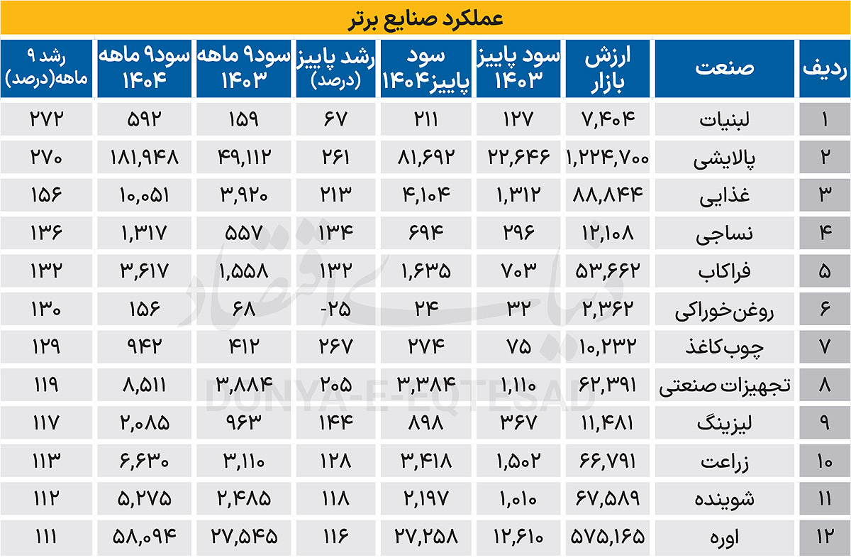 در صنعت لبنیاتی، افزایش حاشیه سود خالص شرکتها نسبت به مدت مشابه سال گذشته، در کنار رشد نرخ محصولات متناسب با تورم غذایی، موجب بهبود سودآوری این صنعت شدهاست. در صنعت پالایشی نیز همزمان با رشد کرک اسپرد محصولات نسبت به ۹ ماهه سال قبل، افزایش نرخ ارز مبادلاتی و حذف نرخ نیمایی، جهش قابلتوجهی در سودآوری رقم خورده است؛ بهطوری که سود ۹ ماهه امسال این صنعت به ۱۸۲ همت رسیده، درحالیکه این رقم در ۹ ماهه سال قبل ۴۹ همت بود.