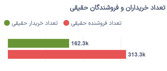 در بخش معاملات حقیقی، حدود ۱۶۲.۳ هزار خریدار حقیقی در بازار سهام پرتفوی خود را سنگین کردند؛ در حالی که ۳۱۳.۳ هزار سرمایهگذار حقیقی اقدام به فروش سهام کردند. این روند نشاندهنده ترجیح فروش سهام در میان بسیاری از سرمایهگذاران است، هرچند که این روند در دقایق پایانی بهبود یافت.