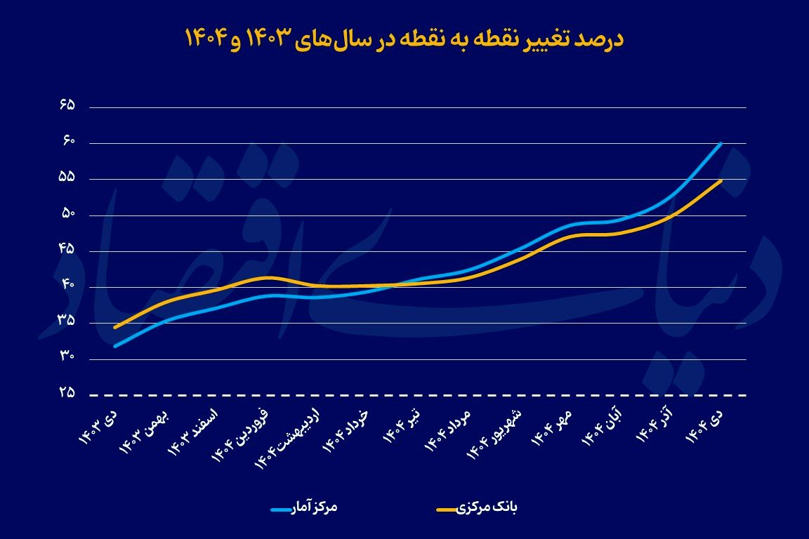پیش از این، مرکز آمار ایران نیز دادههای مربوط به تورم دیماه را منتشر کرده بود. مطابق این آمار، نرخ تورم نقطهبهنقطه در دیماه ۱۴۰۴ معادل ۶۰درصد گزارش شده بود؛ نرخی که بیشتر از ۵واحد درصد از آمار بانک مرکزی بیشتر است و از افزایش قیمتها نسبت به مدت مشابه سال قبل حکایت میکند. مرکز آمار همچنین تورم ماهانه دیماه را ۷.۹درصد اعلام کرده است که نشاندهنده جهش قابلتوجه قیمتها در فاصله یک ماه است. این در حالی است که تورم ماهانه دی ماه توسط بانک مرکزی ۵.۷درصد اعلام شده است. تورم سالانه نیز بر اساس محاسبات بانک مرکزی به ۴۴.۶درصد رسیده است.