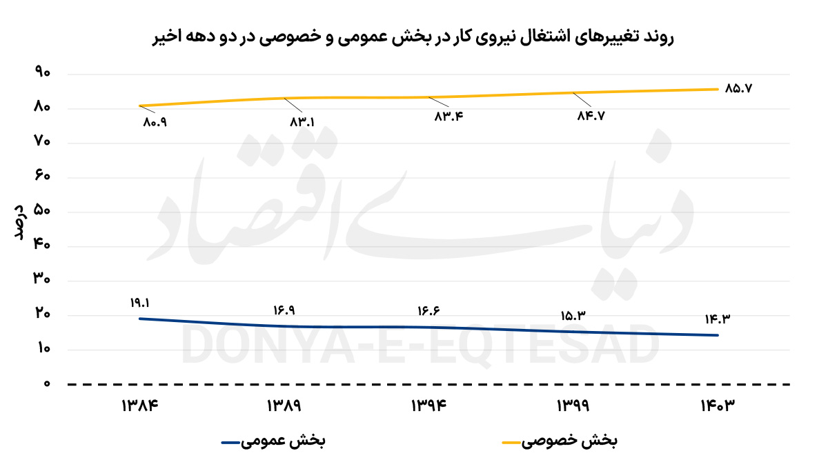 در کنار این مساله، گستردگی اشتغال غیررسمی یکی دیگر از عوامل ساختاری بیثباتی شغلی است. در سال ۱۳۹۹، از حدود ۳میلیون و ۶۰۰ هزار زن شاغل، نزدیک به ۲میلیون نفر در مشاغل غیررسمی فعالیت داشتهاند؛ یعنی ۵۷درصد از اشتغال زنان خارج از پوششهای رسمی بیمهای و حمایتی بوده است. همزمان، در سالهای اخیر سهم اشتغال در بخش عمومی که عمدتا رسمی بوده کاهش یافته و در مقابل، اشتغال در بخش خصوصی افزایش پیدا کرده است. رشد مشاغل خوداشتغالی نیز قابلتوجه بوده است؛ بهطوری که سهم کارکنان مستقل از حدود ۳۰درصد در سال ۱۳۸۴ به حدود ۳۷درصد در سال ۱۴۰۱ رسیده است. این نوع مشاغل، بهدلیل نبود حمایتهای نهادی، بیش از سایر اشکال اشتغال در معرض بیثباتی قرار دارند.