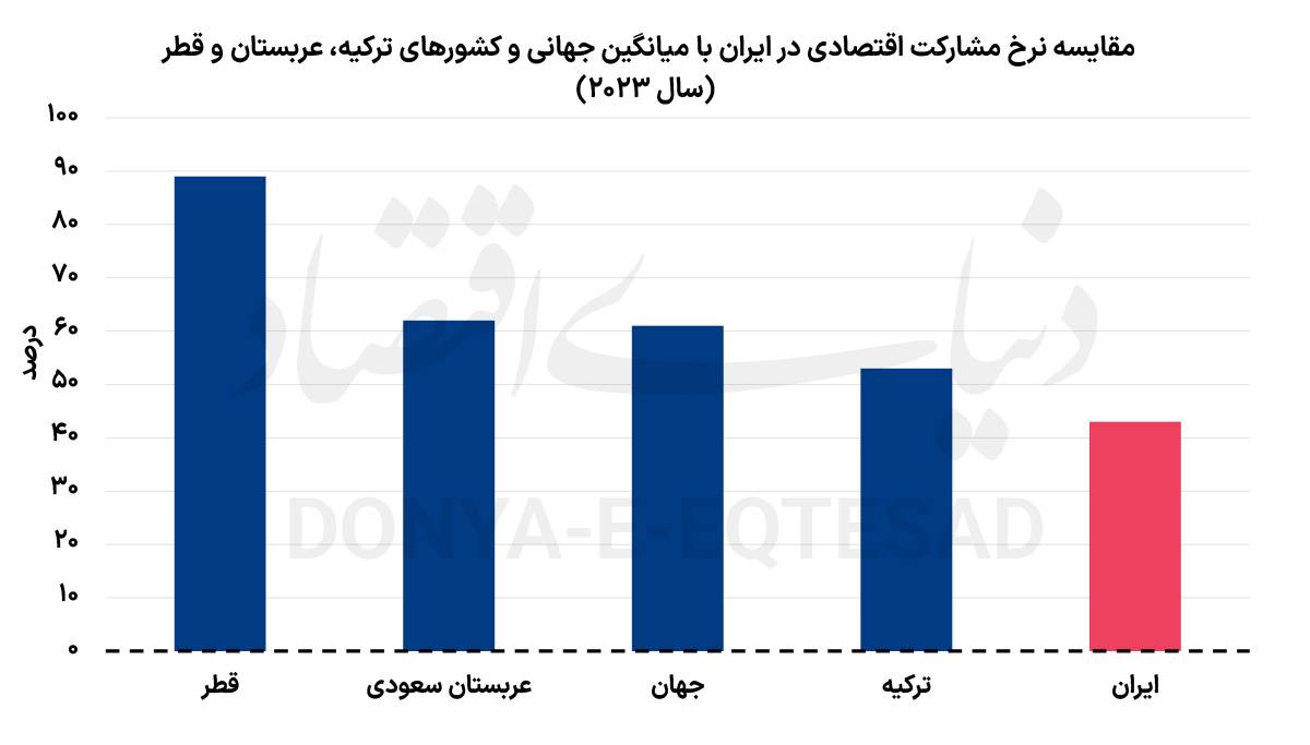 مقایسه منطقهای و جهانی نیز نشان میدهد مشارکت اقتصادی در ایران پایینتر از بسیاری از کشورهاست. نرخ مشارکت در ایران برابر 43درصد است، درحالیکه این رقم در ترکیه 53درصد، در قطر 89درصد، در عربستان سعودی 62درصد و متوسط جهانی نیز 61درصد اعلام شده است. این فاصله معنادار نشان میدهد بازار کار ایران نهتنها با مشکل کمبود شغل، بلکه با مساله جدی جذب و نگهداشت نیروی کار، بهویژه زنان، مواجه است.