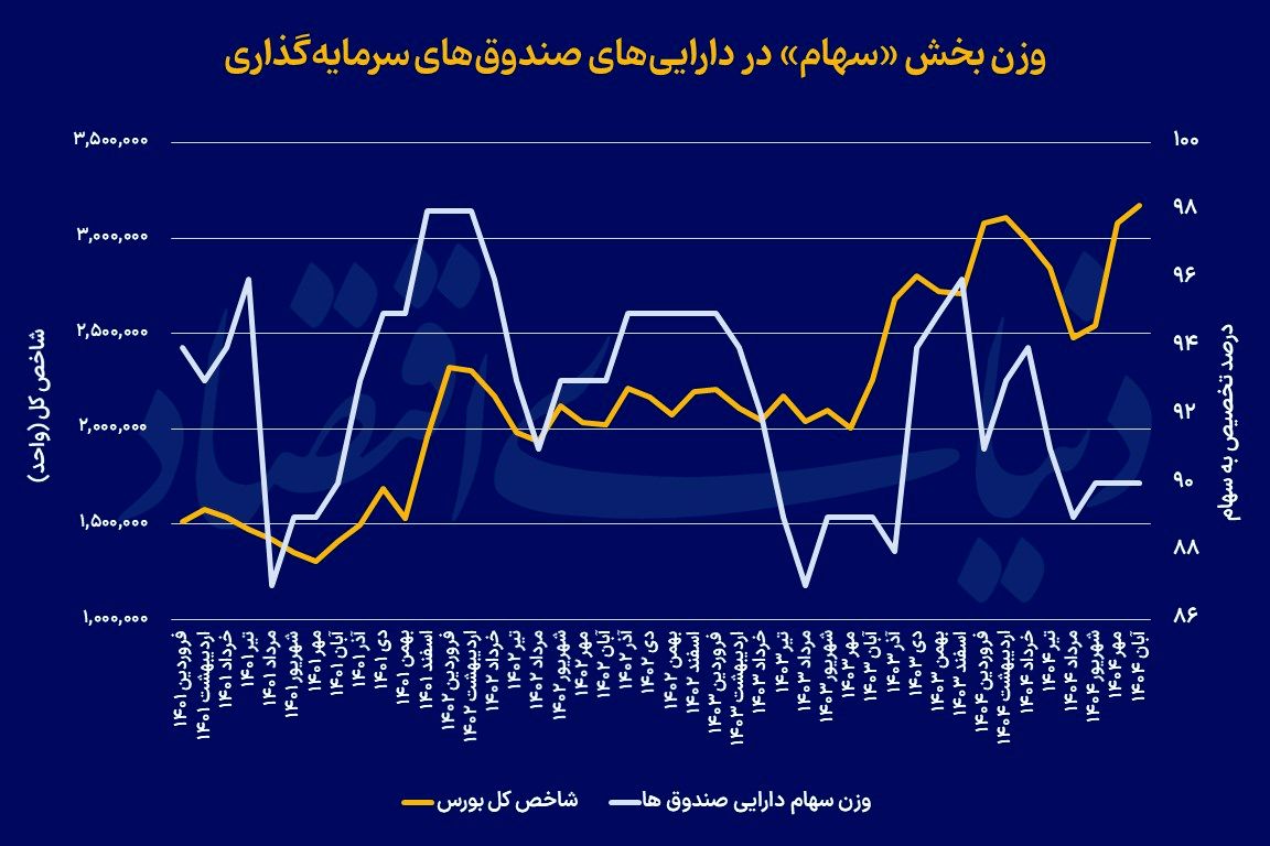 به گزارش دنیای بورس به نقل از دنیای اقتصاد، بررسی رفتار مدیران صندوقهای سرمایهگذاری طی مقاطع مختلف زمانی در مقایسه با شاخص کل بورس میتواند تصویر روشنتری از کارآیی ابزارهای سرمایهگذاری غیرمستقیم در اختیار اهالی بازار ارائه دهد. صندوقها بهعنوان بازیگران حرفهای و نهادی بازار، تصمیمات خود را بر پایه تحلیلهای بنیادی، متغیرهای کلان اقتصادی و چشمانداز صنایع اتخاذ میکنند؛ از این رو، تغییرات در ترکیب داراییهای آنها میتواند بازتابی از انتظارات حرفهایها نسبت به آینده بازار باشد. بررسی دارایی صندوقهای سرمایهگذاری طی چهار سال اخیر و نوسانات درصد تخصیص این داراییها به بخش «سهام» احتمالا سنجه آماری مناسبی از رفتار نهادهای مالی در قبال فراز و فرودهای بورس تهران به دست میدهد. علاوه بر آن، سرمایهگذاران خرد نیز این امکان را دارند که با الگو گرفتن از این رفتار حرفهای، سبد سرمایهگذاری خود را با منطق ریسک و بازده تعدیل کنند و از تصمیمات هیجانی فاصله بگیرند.