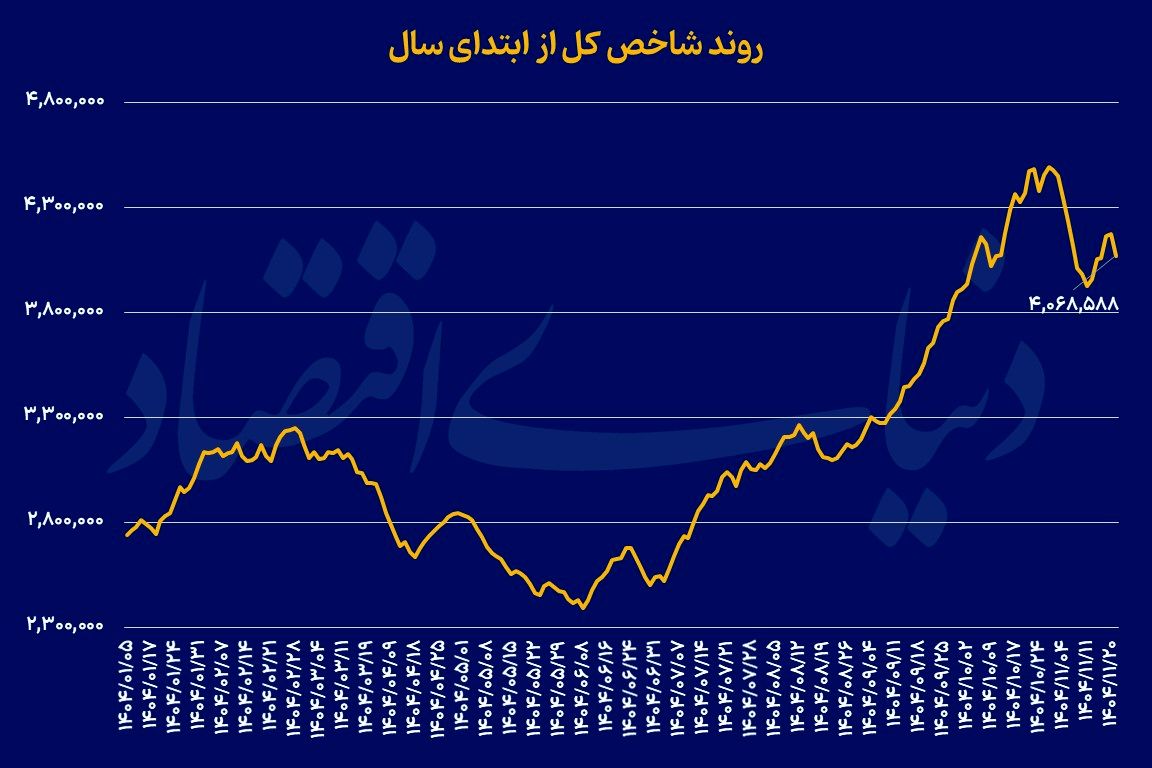 شاخص کل بورس تهران در معاملات روز گذشته با افت بیش از ۲.۵ درصدی، کانال ۴.۱ میلیون واحد را از دست داد؛ افتی که همزمان با تشدید نااطمینانیهای سیاسی و افزایش تقاضا برای داراییهای امن، فضای بازار سهام را بار دیگر منفی کرد.