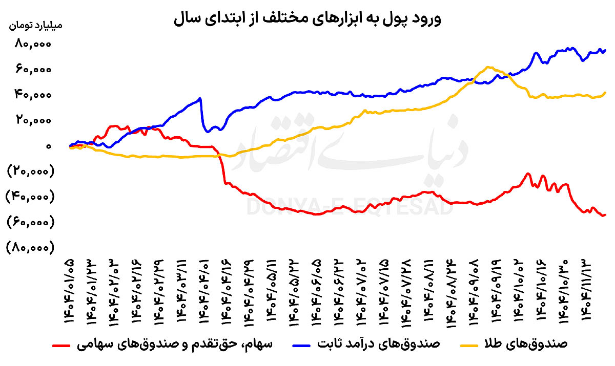 بررسی روند تحولات پول حقیقی نشان میدهد از ابتدای سال تا پایان هفته گذشته، صندوقهای درآمد ثابت با جذب حدود ۷۶هزار و ۳۹۴میلیارد تومان سرمایه خرد حقیقی در جایگاه نخست قرار گرفتهاند. در رتبه بعدی، صندوقهای طلا با ثبت ورود بیش از ۴۳هزار و ۲۲۷میلیارد تومان سرمایه حقیقی ایستادهاند. در مقابل، بازار سهام شامل سهام، حقتقدم و صندوقهای سهامی، با خروج حدود ۵۲هزار و ۶۹۵میلیارد تومان پول حقیقی مواجه شده است. این آرایش آماری به خوبی نشان میدهد که ترجیحات سرمایهگذاران خرد در سال جاری دستخوش تغییر جدی شده است.