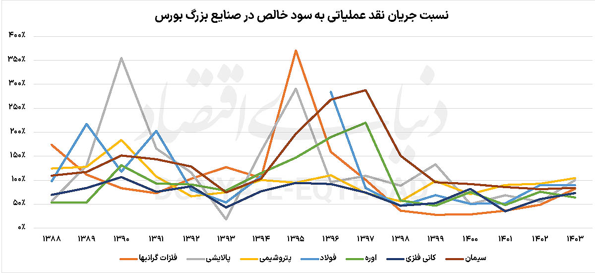 پروژههایی که در گذشته با پیشپرداخت و گردش سریع منابع همراه بودند، اکنون با تاخیر در پرداخت صورتوضعیتها و کندی پیشرفت مالی مواجهاند. این مساله باعث شده اگرچه فروش اسمی به دلیل تورم بالا باقی مانده، اما کیفیت آن کاهش یابد. شرکتها سود شناسایی میکنند، اما وجه نقد دیرتر وارد چرخه عملیاتی میشود. این شکاف میان سود حسابداری و جریان نقدی، یکی از نشانههای کلاسیک رکود عمیق است بهخصوص آن که نسبت جریان نقد عملیاتی به سود خالص، در صنعت فولاد با کاهش شدیدی همراه بوده است. این موضوع نشان میدهد که سودهای این صنعت صرفا یک عدد است و کیفیت نقدشوندگی آن بسیار پایین است.