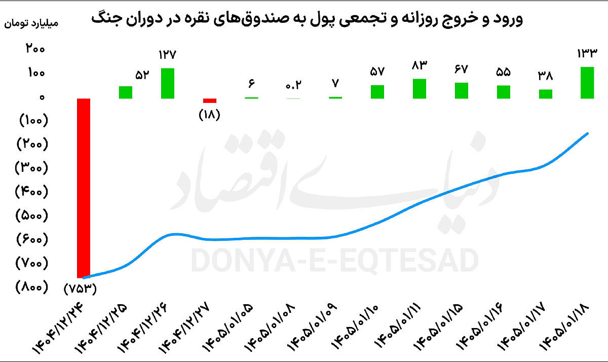 صندوق‌های درآمد ثابت در روز گذشته، سنگین‌ترین میزان خروج پول حقیقی در ۱۶ روز معاملاتی اخیر را تجربه کردند. در روز گذشته، ۲ هزار و ۷۳۱‌میلیارد تومان پول حقیقی از صندوق‌های درآمد ثابت خارج شد؛ به‌رغم خروج پول از این صندوق‌ها در روز گذشته، همچنان خالص خرید حقیقی‌ها در صندوق‌های درآمد ثابت مثبت است و صندوق‌های مذکور در ۱۷ روز معاملاتی تجربه‌شده در دوران جنگ، با ورود ۱۰ هزار و ۷۰۱‌میلیارد تومان پول حقیقی همراه شده‌اند. همان‌طور که در گزارش‌های قبلی دنیای اقتصاد نیز اشاره شده، خروج پول‌های این چنینی از ابزارهای فعال بازار سرمایه، در راستای تامین نقدینگی برای خرید مایحتاج ضروری و هم‌چنین ترس از قفل‌شدن سرمایه در این ابزارها در صورت توقف مجدد معاملات این ابزارها صورت می‌گیرد.