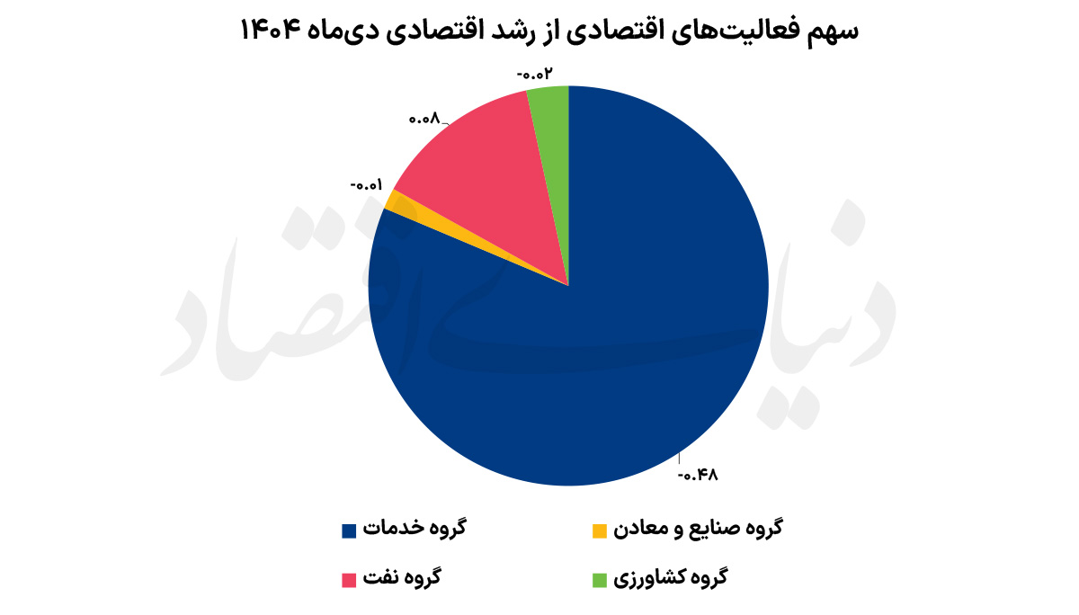 طبق برآوردها، از رشد منفی 0.4 واحد درصدی تولید ناخالص داخلی به قیمت پایه، گروه کشاورزی سهمی برابر با منفی 0.02 واحد درصد و گروه صنایع و معادن سهمی معادل منفی 0.01 واحد درصد داشته‌اند. با این حال، اصلی‌ترین عامل کاهش رشد، گروه خدمات بوده که سهمی در حدود منفی 0.48 واحد درصد را به خود اختصاص داده است. در میان گروه‌های اقتصادی، تنها گروه نفت عملکردی مثبت داشته و با سهم 0.08 واحد درصدی بیشترین اثر افزایشی را بر رشد دی‌ماه به‌جا گذاشته است؛ موضوعی که تا حدی از شدت افت سایر بخش‌ها کاسته است.