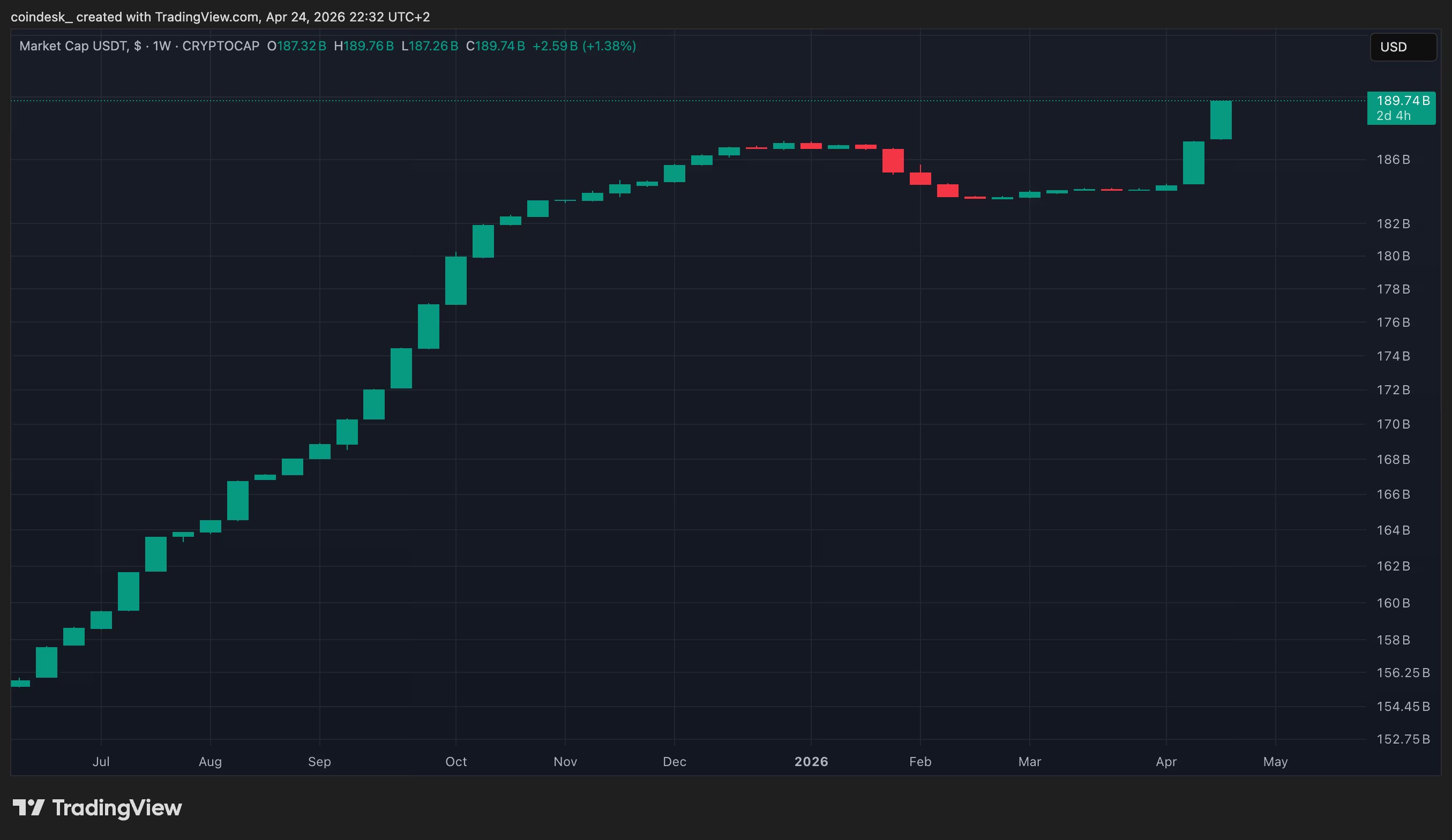 عامل دیگری که به این بازگشت کمک کرده، رشد عرضه استیبلکوین تتر (USDT) است. عرضه این ارز دیجیتال بهعنوان بزرگترین و محبوبترین استیبلکوین جهان، به کمتر از ۱۵۰ میلیارد دلار افزایش یافته است و طی دو هفته گذشته حدود ۵ میلیارد دلار به آن اضافه شده است.