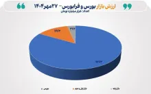 در مبادلات امروز ارزش بازار سهام بورس تهران معادل ۹ هزار و ۲۶۳ هزار میلیارد تومان و ارزش بازار فرابورس به همراه بازار پایه معادل یک هزار و ۸۳۵ هزار میلیارد تومان بود.