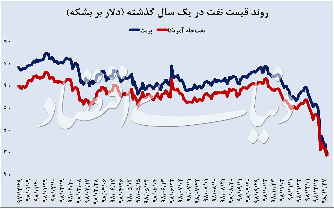 شیوع کرونا: اما شاید مهمترین بازیگر بازار نفت در سال ۹۸ ویروس کوچکی بود که از چین آغاز به شیوع کرد. ویروس کرونا از ۳۰ دی ماه شیوعش در رسانهها اعلام شد و براساس محاسبات دانشگاه جان هاپکینز تا دیروز بیش از ۱۸۲ هزار نفر را مبتلا کرده و بیش از ۳ هزار نفر را به کام مرگ کشانده است. از زمان ورود کرونا به معادلات بازار نفت، بهای طلای سیاه از ۲/ ۶۵ دلار به حدود ۳۰ دلار سقوط کرده که به معنای کاهش ۵۳ درصدی ارزش این کامودیتی است.