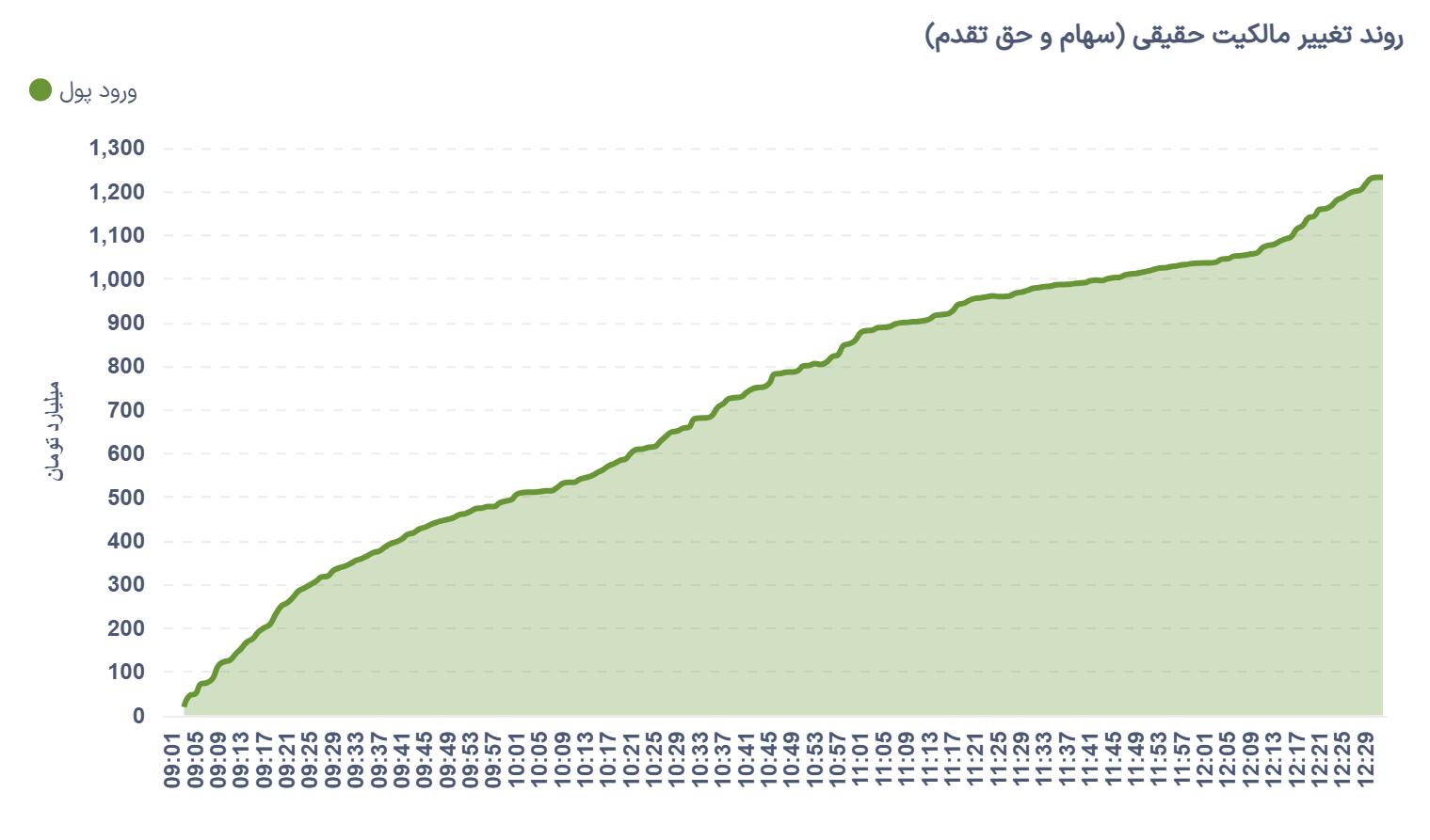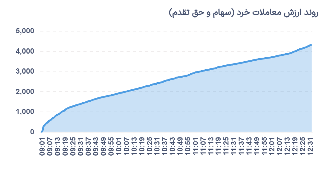 در این روز معاملاتی، 613 نماد مثبت معامله شدند و 102 نماد نیز منفی بودند. روند ارزش معاملات خرد سهام و حق تقدم صعودی بود.