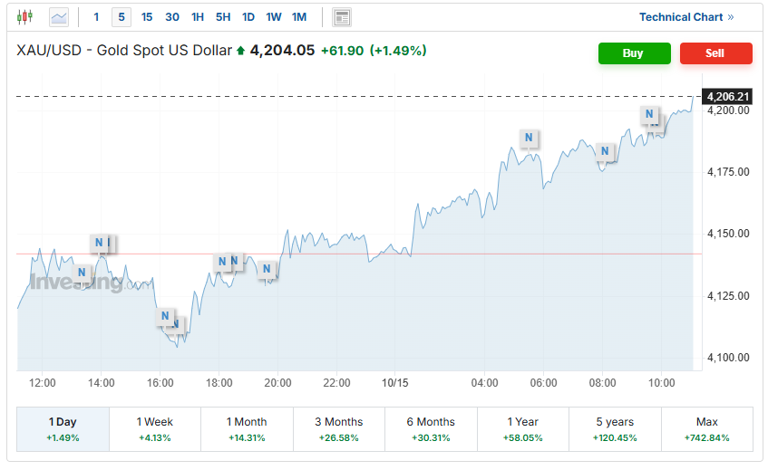 پس از آن، طلا نیز در مسیر رکوردزنیهای پیدرپی قرار گرفت و از مرزهای ۴,۰۰۰، سپس ۴,۱۰۰ و نهایتاً ۴,۲۰۰ دلار عبور کرد. این روند صعودی که از ابتدای ماه سپتامبر آغاز شده، اکنون به نقطهای بیسابقه رسیده است؛ جایی که بهای هر اونس طلای جهانی در لحظه تنظیم این گزارش، با رقم ۴,۲۰۶ دلار در حال معامله است—سطحی که نماد بازگشت قدرتمند سرمایه به داراییهای امن و واکنشی روشن به چشمانداز کاهش نرخ بهره و تشدید نااطمینانیهای اقتصادی جهان است.