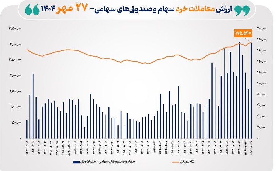 به گزارش دنیای بورس به نقل از سنا، دادههای آماری مدیریت نظارت بر بورسهای سازمان بورس و اوراق بهادار نشان میدهد امروز یکشنبه ۲۷ مهر ۱۴۰۴ ارزش کل معاملات خرد (سهام و صندوقهای سهامی) به ۱۷۵،۵۴۷ میلیارد ریال رسید.