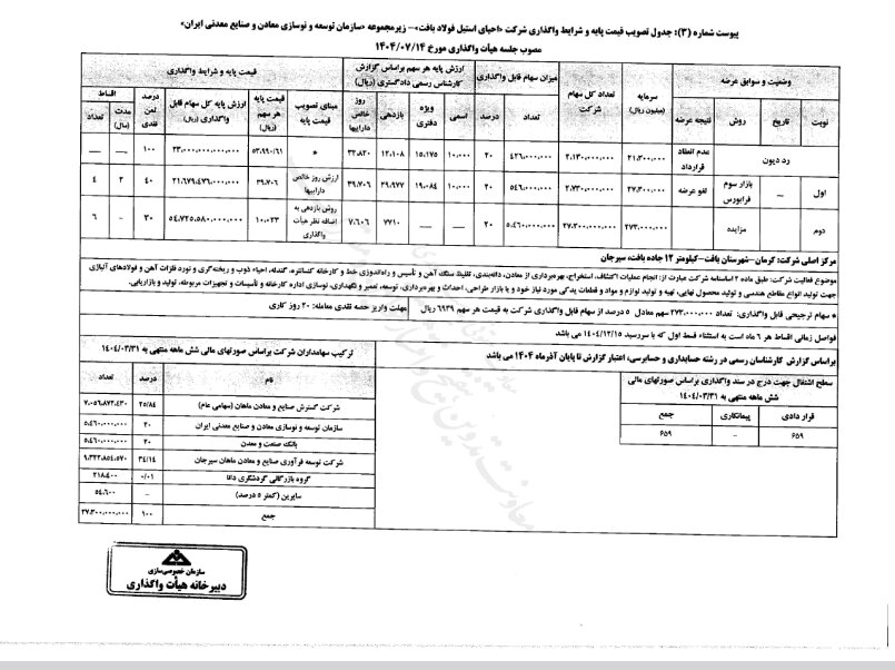 در این جلسه قیمت پایه و شرایط واگذاری ۲۰ درصد سهام شرکت احیای استیل فولاد بافت متعلق به سازمان توسعه و نوسازی معادن و صنایع معدنی ایران مطرح و با واگذاری سهام مذکور پس از کسر سهام ترجیحی بر اساس روش بازده به اضافه نظر هیأت واگذاری با قیمت پایه هر سهم به مبلغ ۱۰،۰۲۳ ریال جمعاً به ارزش ۵۴،۷۲۵،۵۸۰،۰۰۰،۰۰۰ ریال و با شرایط ۳۰ درصد نقد و قسط اول با سررسید ۱۴۰۴/۱۲/۱۵ و مابقی در ۵ قسط با فواصل زمانی ۶ ماهه از طریق مزایده عمومی موافقت شد.