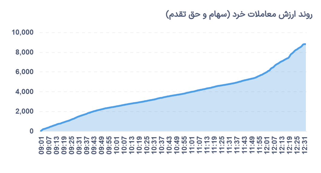 در روز جاری ارزش معاملات خرد سرمایه گذاران رو به افزایش بود. 249 صف فروش و 62 سف خرید، نشان دهنده عرضه شدید سهام  در این روز معاملاتی   است. ضمن آن که امروز 519 نماد منفی و 201 نماد مثبت بودند.
