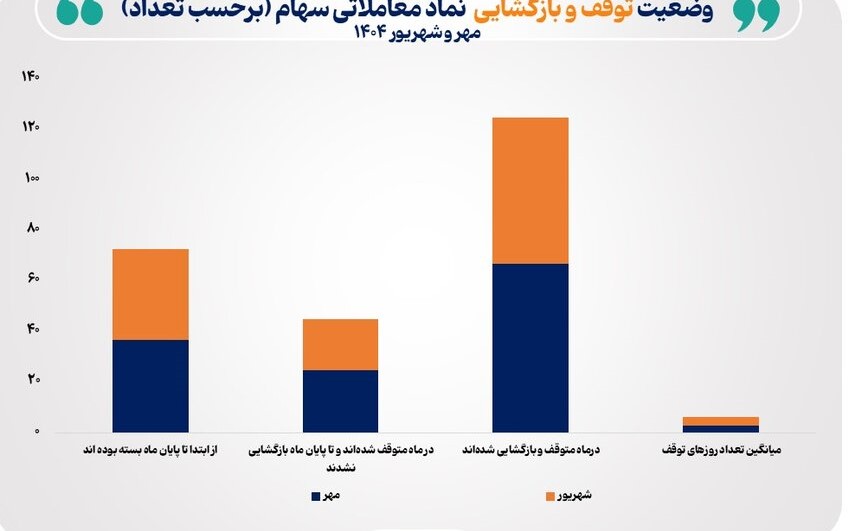 در گزارش آماری ماهانه سازمان بورس و اوراق بهادار وضعیت توقف و بازگشایی نمادهای معاملاتی بازار اول و دوم سهام بورس تهران و فرابورس ایران، به تفکیک ماه بررسی میشود که در ادامه به نتایج این بررسی در مهر ۱۴۰۴ خواهیم پرداخت.